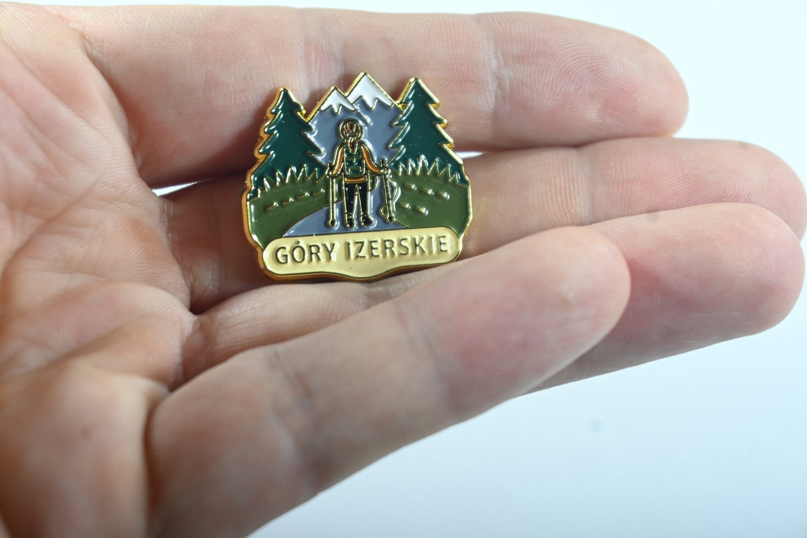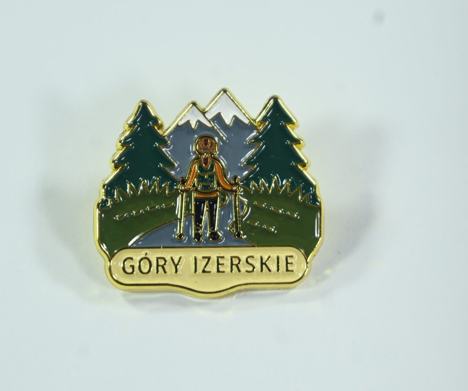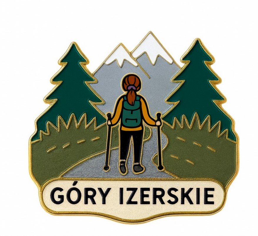 Metalowa przypinka przedstawiająca turystkę przemierzającą szlaki Gór Izerskich, w otoczeniu świerkowych lasów i charakterystycznych izerskich panoram. Idealna dla osób, które kochają piesze wędrówki, leśne klimaty i spokojne górskie doliny.