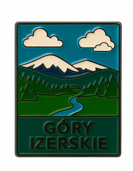 Metalowa przypinka inspirowana malowniczym krajobrazem Gór Izerskich — zielonymi dolinami, ciemnymi świerkami i błękitem odległych grzbietów. Idealna dla miłośników Sudetów i wszystkich, którzy chcą zabrać ze sobą kawałek górskiej magii.