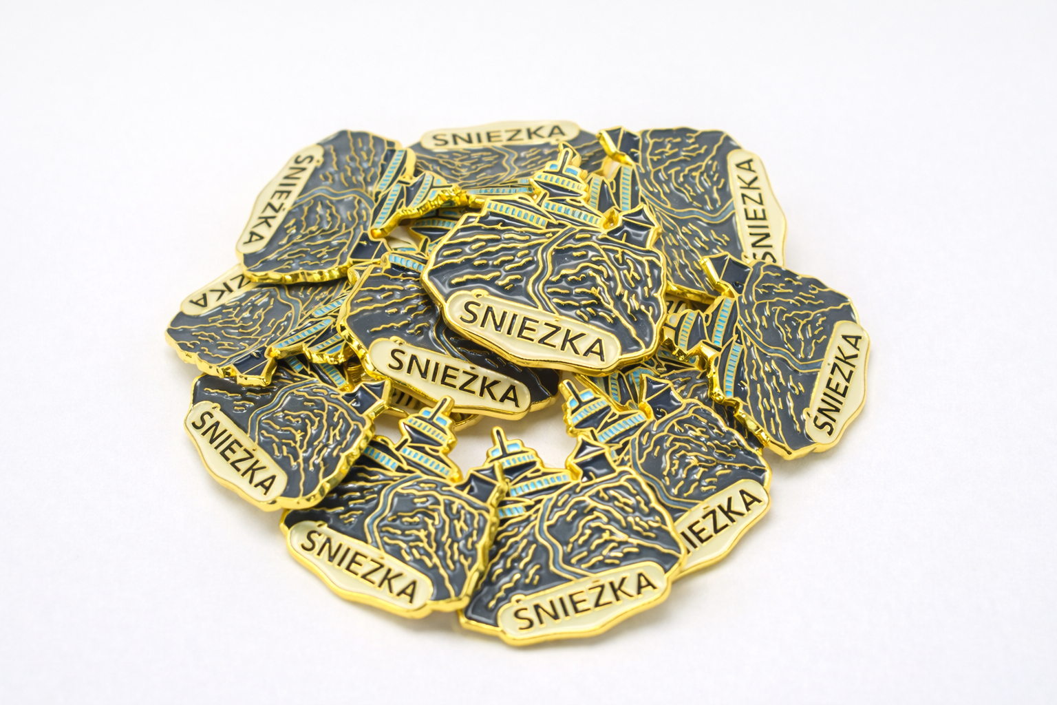 Metalowa przypinka przedstawiająca kultową Śnieżkę — najwyższy szczyt Karkonoszy i całych Sudetów. Charakterystyczne obserwatorium oraz kaplica św. Wawrzyńca zostały odwzorowane z dbałością o detale, a złote kontury nadają przypince eleganckiego, kolekcjonerskiego wyglądu.