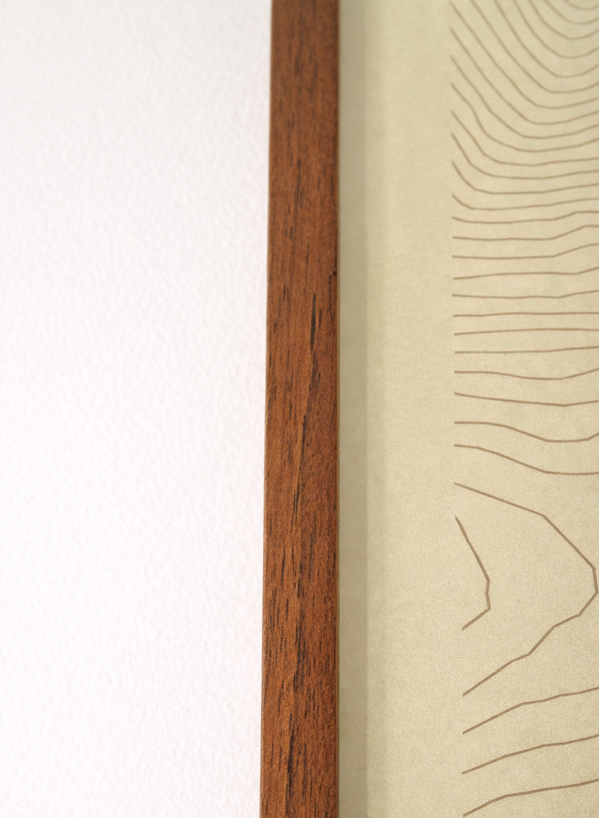 Rama MUGO to elegancka oprawa wykonana z naturalnego drewna, wyróżniająca się ciepłym, głębokim odcieniem brązu i wyraźnym rysunkiem słojów. Jej klasyczny, prosty profil podkreśla naturalny charakter materiału, nadając całości szlachetności i spokojnej elegancji.