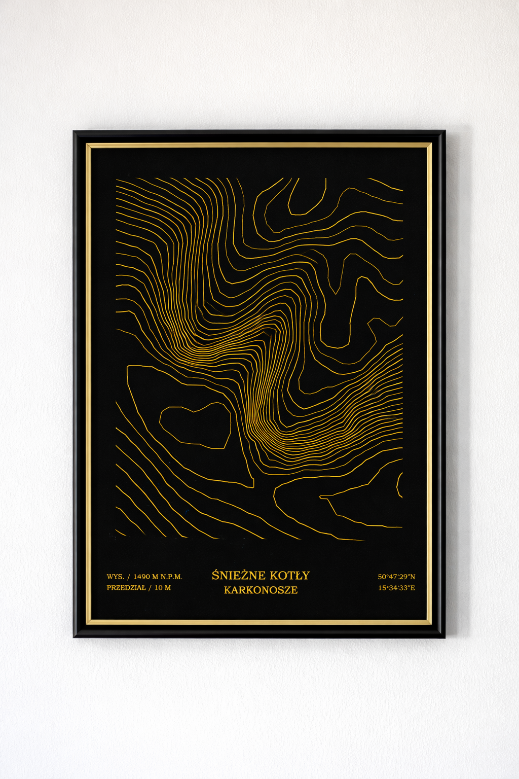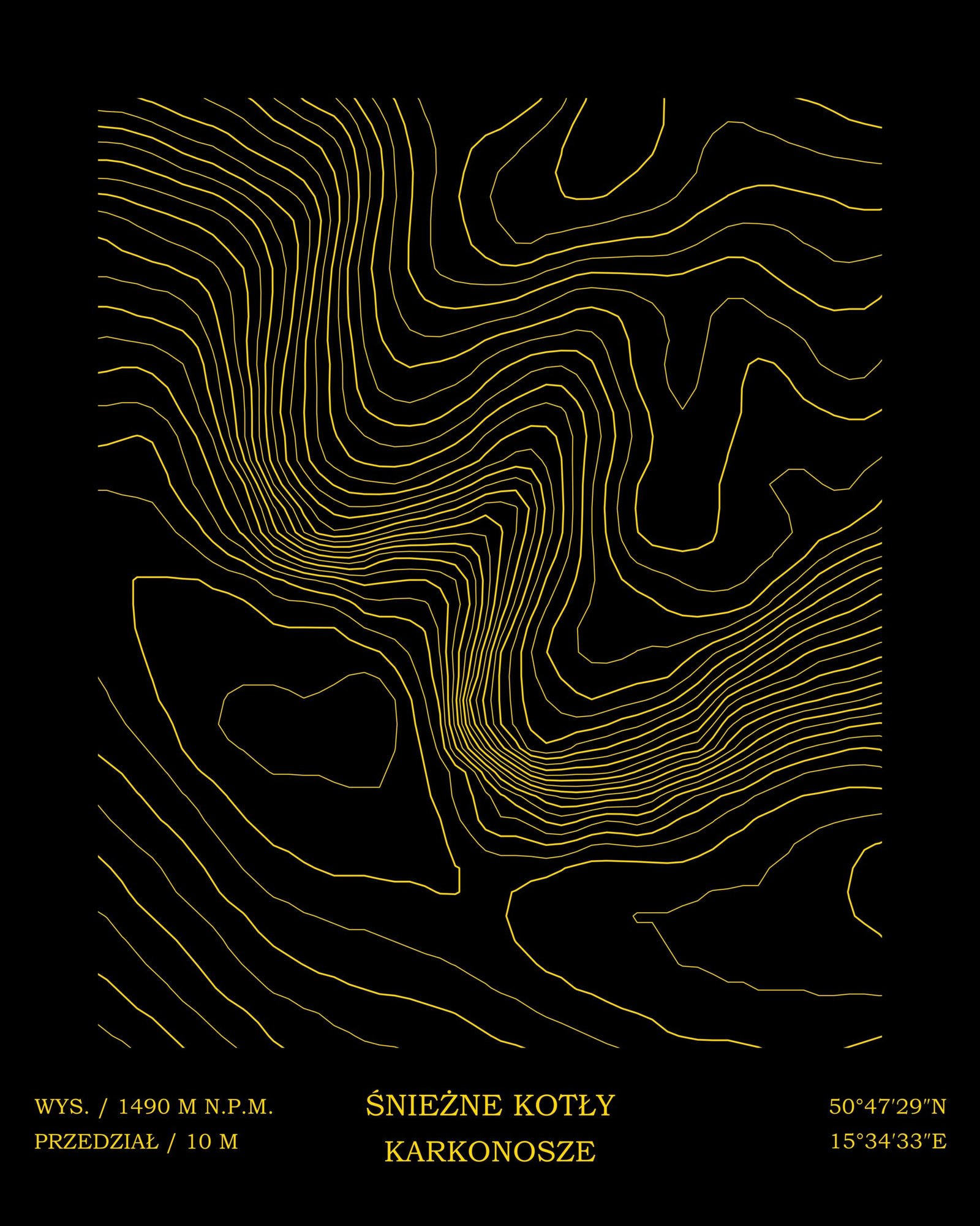 Złote poziomice na głębokim, czarnym tle budują silny kontrast i podkreślają dramatyzm krajobrazu. Linie zagęszczają się w miejscach stromych spadków, tworząc wyraźne wizualne napięcie i nadając mapie niemal rzeźbiarski charakter. To kompozycja inspirowana surową geologią i monumentalnością Karkonoszy, a jednocześnie utrzymana w nowoczesnym, graficznym minimalizmie.